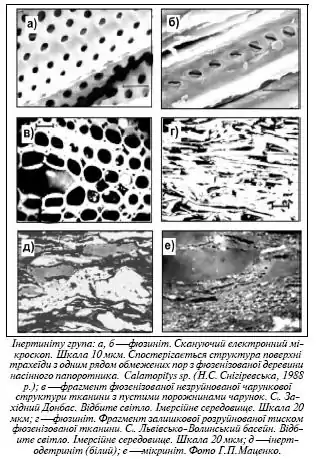 Інертинітова група включає мацерали різного походження: 1) тканини (грибів або рослин більш високого рівня); 2) тонкі уламкові фрагменти; 3) геліфікований аморфний матеріал, з якого сформувався ґранульований матеріал переважно в ході вуглефікації і в якому змінилися секреції клітин за рахунок окислювально-відновних і біохімічних процесів при торфоутворенні.
