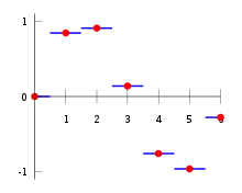 Результат інтерполяції методом найближчого сусіда (сині лінії) для функції однієї змінної. Вихідні значення функції (червоні точки) задані на регулярній сітці.