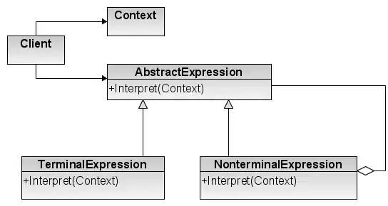 - у кожному вузлі виду NonterminalExpression через операції Interpret визначається операція Interpret для кожного підвиразу. Для класу TerminalExpression операція Interpret визначає базу рекурсії;