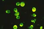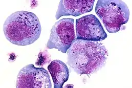 ![]() ГВЛ-6 у інфікованих клітинах у вигляді тілець, що включені як у ядро, так і до цитоплазми. Мікрофотографія, фарбування гематоксилін-еозином. | ||||||||||||||