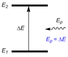 При поглинанні фотона відбувається збудження — збільшення енергії молекули: вона переходить із основного коливального стану E1 в деякий збуджений коливальний стан E2 так, що енергетична різниця між цими рівнями дорівнює енергії фотона[7].
