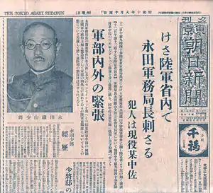 Після жовтневого інциденту 1931 року в Імперській армії Японіїї утворилися дві фракції, які почали ворогувати між собою — фракція контролю (統制派) і фракція імператорського шляху (皇道派). У березні 1934 року один із лідерів першої фракції, Наґата Тецудзан, був призначений начальником служби воєнних справ Міністерства Армії Японії, у зв'язку з чим посилилося переслідування фракції опонентів. Через це Айдзава Сабуро, який поділяв погляди молодого офіцерства фракції імператорського шляху, убив Наґату як відповідального за репресії в армії. Молоде офіцерство використало судовий процес над своїм однодумцем для декларації опору ворожій фракції, а згодом вчинило спробу державного перевороту 26 лютого 1936 року. Заколот провалився, а 3 липня 1936 року Айдзаву Сабуро було страчено за вироком військового трибуналу.