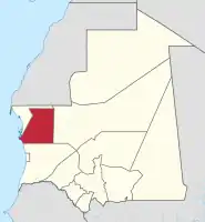 На півночі та північному заході межує з областю Дахлет-Нуадібу, на сході — з областю Адрар, на півдні — з областю Трарза. На південному заході виходить до Атлантичного океану.