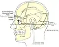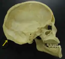 Череп, вид збоку (ініон видно в посередині праворуч)