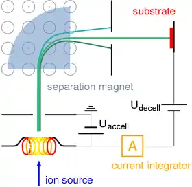 Іонізація атомів домішки, прискорення іонів та фокусування іонного пучка виконується у спеціальних установках типу прискорювачів частинок у ядерній фізиці.
