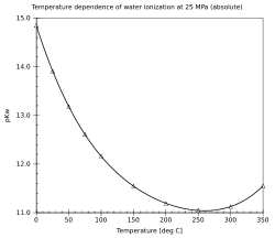 На величину іонного добутку значною мірою впливає температура, оскільки при її зростанні підвищується ступінь дисоціації речовини. Так, за температури 100 °C показник pKw вже становить 12,265 (проти 14 за стандартної температури 25 °C).