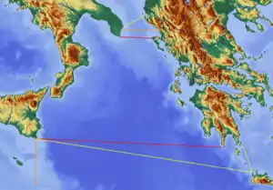 - На півдні: лінія від мису Тенарон до мису Пассеро, південної точки Сицилії.