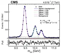 Перші три стани , та розташовані нижче порогу розпаду в два B-мезони і тому мають достатньо довгий час життя як для такої масивної частинки (див. Правило Окубо-Цвейга-Ізуки) та великі ймовірності електромагнітних розпадів. Завдяки цьому, їх легко виявити експериментально з допомогою їх розпадів у два мюони або два електрони: вони проявляються у вигляді вузьких піків в розподілі інваріантної маси. Ця властивість є зручною для калібрування шкали маси нових детекторів елементарних частинок[4].