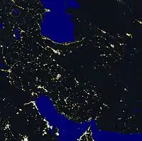 Іран вночі. Видно, що терени на південний схід від Тегерану погано заселені та малорозвинені