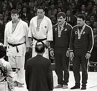 ![]() Дуг Роджерс, Ісао Інокума, Парнаоз Чіквіладзе і Анзор Кікнадзе на літніх Олімпійських іграх 1964 Дуг Роджерс, Ісао Інокума, Парнаоз Чіквіладзе і Анзор Кікнадзе на літніх Олімпійських іграх 1964 | |