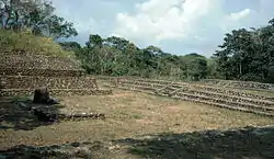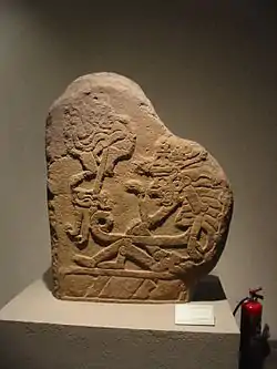 Зі стели, розбитої ще в давнину на шматки, відомий бородатий бог Ісапи, якого зв'язано мотузкою, а замість очей стирчить тризуб. Він є, на думку дослідників, попередником деяких божеств з Тікаля в центральній області мая.