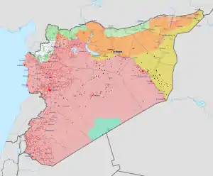 - Сирійський фронт: на початку серпня 2013 бойовики ІДІЛ атакували позиції курдських бойовиків на прикордонних з Туреччиною територіях Сирії[82]. Восени 2013 року бойовики ІДІЛ вели бойові дії в районі сирійських міст Ідліб, Алеппо[83] і Аазаз як проти «Вільної сирійської армії»[84], так і проти курдських ополченців[85].