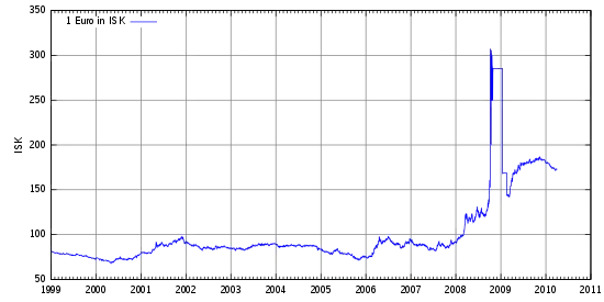 У 2008 внаслідок фінансової кризи ісландська крона знецінилася на 85% по відношенню до євро, після чого в країні велися розмови про вступ Ісландії до ЄС та перехід на євро (див. Фінансова криза 2008 року в Ісландії).[2][3]
