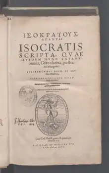 - Любкер Ф. Isocrates // Реальный словарь классических древностей по Любкеру / под ред. Ф. Ф. Зелинский, А. И. Георгиевский, М. С. Куторга и др. — СПб: Общество классической филологии и педагогики, 1885. — С. 670–671.