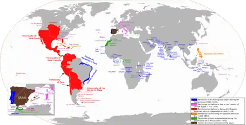 Французька окупація Іспанії в 1808, на чолі з Наполеоном І тимчасово відрізало її від американських колоній, і ріст рухів за незалежність 1810–1825, призвело до створення низки нових незалежних іберо-американських республік в Південній та Центральній Америці. Куба, Пуерто-Рико, й Іспанська Ост-Індія, продовжувала залишатися під іспанським контролем до кінця 19 століття, коли велика частина цих територій була приєднана до США після іспансько-американської війни. Решта островів у Тихому океані було продано Німеччині в 1899 році.