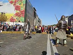 Серед видів боїв, представлених на фестивалях, зокрема є: сучасний мечoвий бій (Modern Sward Fighting)[5], учасники якого застосовують середньовічні техніки бою, проте із застосуванням виключно сучасного тренувального обладнання. Для цією групи важливою є саме техніка бою; Історичні Європейські бойові мистецтва (Historical European Matrial Art), також відома під назвою ХЕМА (HEMA)[6] займається дослідженням історичних технік бою на основі збережених джерел – фехтбуків. До прикладу міжнародна асоціація яка має свої осередки в країнах Північної Америки та Європи ХЕМА Альянс (HEMA Alliance). Їхньою ціллю є історична достовірність технік бою, що є частиною явища інсценізації в плані того, що це реальний бій, в якому використовують стиль бою та зброю відповідну до періоду; також до боїв відносяться поєдинки любителів, що відбуваються під час фестивалів. Варто зауважити, що любителями є учасники історичних товариств, які беруть участь у фестивалі. Їхні дії спрямовані на розвагу: як глядачів, так і власну, у вигляді змагань між клубами.