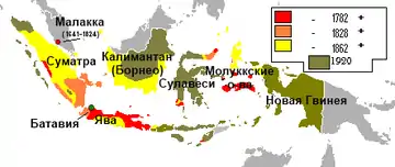 На початок 1720-х років НОІК вдалося витіснити з архіпелагу португальців — єдиним володінням, яке вдалося утримати Лісабону, була східна частина острова Тимор. У 1727 році, після серії військових зіткнень з голландцями, останніх володінь тут позбулися британці (освоєння ними північної частини Калімантану і Сінгапуру почалося значно пізніше, в XIX столітті)[59].