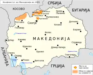 Події 1999 р. в Косово стали детонатором нового витка сепаратистського руху албанців у Македонії. З 2000 р. Македонія стала ареною протистояння македонської більшості та албанських меншин. У березні 2001 р. на північному заході країни почалися збройні сутички між урядовими військами та албанцями,[22] що виступали за пропорційну участь у всіх державних структурах, за албанську автономію з центром у місті Тетово в Західній Македонії і навіть за об'єднання всіх албанців (Албанії, Косова, Тетова, Північної Греції) в єдину Велику Албанію. Албанські сепаратисти сформували так звану Армію національного звільнення (АНЗ). Екстремістські елементи албанської етнічної меншини здійснили наступ на Скоп'є за участі сил Армії звільнення Косова.