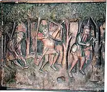 Полювання і бортництво новгородців, різьблення на лаві в Штральзунді, XIV століття
