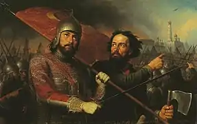 Після об'єднання новгородських і київських земель київський князь став називатися «великим князем»[12]. Він правив за допомогою ради, що складалася з інших князів і дружинників. Збір данини здійснювався самим великим князем за допомогою старшої дружини (так звані бояри, мужі). Була у князя молодша дружина (гриди, отроки). Найдавнішою формою збору данини було осіннє «полюддя» без чітко встановленої норми. Всю зиму князь проводив, об'їжджаючи землі, збираючи данину та чинячи правосуддя. Влітку ж князь зі своєю дружиною зазвичай здійснював військові походи проти ще непідкорених слов'янських та інших племен[10]. Поступово більша частина княжих дружинників ставала землевласниками. Соціальна структура ранньої Русі була нечіткою. Панівний клас був строкатим за своїм складом: великий князь з близькими родичами, представники старшої дружини, найближче оточення князя — бояри, місцеві князі. До числа залежного населення належали холопи[lower-alpha 7], челядь[lower-alpha 8], закупи[lower-alpha 9]) і вільні общинники-смерди як основна маса сільського населення, що поступово потрапляла у феодальну залежність[10][7].