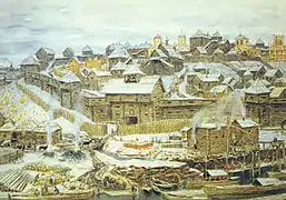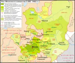 У ІХ-ХІІ століттях володарі Київської Русі підкорюють землі кривичів, словенів, весі, мері, мещери, тобто поширюють свій вплив на землі, які зараз знаходяться у сучасних кордонах Росії. Після розпаду у ХІІ столітті єдиної Київської Русі з центром у Києві постає ряд самостійних руських князівств. Протягом тривалого часу найбільш могутнім було Володимиро-Суздальське князівство, територія якого згодом стала ядром Московського царства (Московії)[25]. На час правління засновника удільного князівства великого київського князя шостого сина Володимира Мономаха Юрія Долгорукого (1125—1157) припадає перша літописна згадка про Москву (під 1147 роком)[26], з приводу запрошення на перемовини союзника, новгород-сіверського князя Святослава Ольговича:
