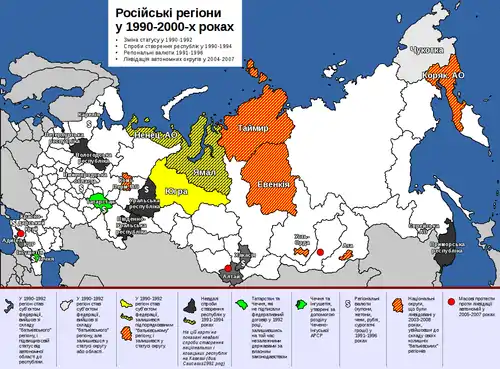 Від грудня 1991 року російська держава існує у формі самостійної Російської Федерації, яка проголошує правонаступність до Радянського Союзу, зберігаючи постійне членство в Раді Безпеки ООН і оперуючи ядерним арсеналом СРСР. У новій державі було запроваджено ринкові відносини в економіці та скасовано планове державне управління, відбулось масоване роздержавлення підприємств (приватизація), розпочинається економічне пожвавлення. Сепаратистські рухи гасяться дипломатичними засобами (Татарстан), або військовим втручаням (Ічкерія). Економічна криза наприкінці 1990-х років призвела до дефолту 1998 року[⇨]. Після 2000 року зі зростанням світових цін на вуглеводні та приходом до влади «молодого обличчя» Володимира Путіна почалось значне економічне зростання. Це дозволило ставленику від олігархічних кіл перейти від ліберальних методів управління до розбудови міцної «вертикалі влади», проведення адміністративної, військової та інших реформ, придушення політичних опонентів, здійснити перехід до фактично однопартійної системи влади[⇨]. З погіршенням внутрішньополітичної ситуації внаслідок економічної кризи 2008 року, на початку 2010-х років активізується зовнішня політика, як засіб відволікання електорату від внутрішніх проблем, та протестних настроїв. Апогеєм такої політики стала Російська весна 2014 року, коли у відповідь на активну проєвропейську позицію українського народу під час Євромайдану та всупереч договору «про мир та дружбу» були зімітовані протести в південно-східних регіонах, а потім здійснена військова агресія проти України в Криму та на Донбасі[⇨]. Така зовнішня політика з дестабілізації ситуації у Європі була негативно зустрінута міжнародним співтовариством і викликала економічні санкції та політичне охолодження у стосунках між країнами Заходу і Росією. Наступного року Росією було розпочато активну фазу показової військової операції в Сирії. У наступні роки Росія намагалась активно втручатись у внутрішню політику інших держав, використовуючи різноманітні засоби, від впливу на суспільну думку[lower-alpha 2] і хакерських атак[lower-alpha 3] до диверсій[lower-alpha 4] і хімічних атак[lower-alpha 5]. Одночасно для внутрішнього споживання власними громадянами розвивається пропаганда ідеї «Росії у замкненому колі ворогів»[⇨].