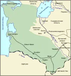 У 60-70-х роках XIX ст. до складу Росії увійшли Бухарський емірат, a після цього Хівінське ханство. У 1869-1885 рр. до складу Росії увійшла територія південного Туркменістану, що утворила Закаспійську область. З 1898 р. ця область стала частиною Туркестанського краю.