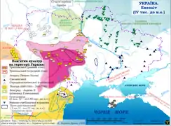 Бронзова доба (III тисячоліття — XII століття до н. е.). Період поширення виробів з бронзи (сплаву міді з оловом, або миш'яком). Аридизація клімату пожвавлює розвиток засобів виробництва, змушує степові племена розвивати кочове скотарство, а лісостепові — орне землеробство. Розширюється асортимент культурних рослин, зароджується садівництво. Продуктивність праці пожвавлює посилення майнової нерівності. Занепад трипільської культури позначився консолідацією скотарів і появою ямної культури (2800—2300 до н. е.), у носіях якої вчені вбачають аріїв, індоєвропейців[15]. Вони охоплювали територію від Криму до Київського Полісся. На базі цієї культури на південному сході Україні постає катакомбна культура (2300—1300 до н. е.), носії якої перебували у контактах з хліборобською культурою шнуркової кераміки (2300—1700 до н. е.), що займала територію північного заходу країни[16]. Після XVII століття до н. е. катакомбну культуру заступила зрубна культура (1700—1300 до н. е.), яка асоціюється з іраномовними племенами скотарів, а культуру шнуркової кераміки на теренах України витіснила тшинецька культура (1700—1200 до н. е.), яку пов'язують із праслов'янсько-балтською спільністю хліборобів[17].