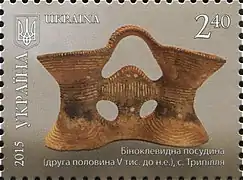 Характерна трипільська біноклевидна посудина на поштовій марці України