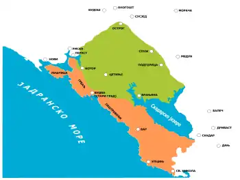 На морському узбережжі в XIII—XIV століттях найбільшим містом був Котор, який підтримував активні торговельні зв'язки з континентальними районами Сербії. Населення Будви, Бара, Ульциня займалось переважно мореплавством, а також суднобудівництвом. Ці міста мали самоврядування та власні статути. Їх населення поділялося на міську знать — властелів і звичайних городян — пучан. Поступово роль Народної Скупщини в міському управлінні впала, і влада перейшла до рук патриціату, що увійшов до складу Великого віча[20].