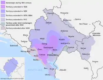 Під час Герцеговинсько-боснійського повстання (1875—1878) Чорногорія надавала підтримку герцеговинським повстанцям. У червні 1876 року Чорногорія разом з Сербією оголосила війну Туреччині. 16 липня в Герцеговині в битві на Вучому Долі чорногорсько-герцеговинські сили здобули перемогу над турецькими військами. 2 серпня на албанському фронті 5-тисячні сили чорногорців в битві на Фундіні розбили 40-тисячне турецьке військо[60]. Сан-Стефанський мир (1878) проголосив незалежність Чорногорії. За рішенням Берлінського конгресу (1878) територія Чорногорії збільшувалася з 4405 км² до 7 тисяч км². Чорногорія отримала міста Подгорицю, Колашин, Нікшич, Жабляк, Ульцинь і Бар з морським узбережжям довжиною 70 км[61].