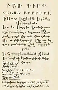 1. Греко-вірменський папірус — словник V—VII століть 2. Сторінка рукопису XVIII століття граматики Симеона Джугаєці 3. «Словник вірменської мови», том I, Мхітара Севастійського, Венеція, 1749 рік | ||||||||||