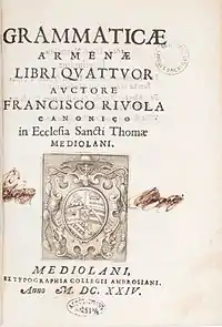 На початку XVII століття жив італійський вірменіст Франческо Рівола, який видав у 1624 році[96] вірменську граматику. Його праця, що відкриває епоху, ще вільна від сильної латинізації і «раціоналізації» граматичних правил, що стало властиво подальшим авторам. Через недостатнє володіння вірменською мовою, дослідження, що складається з чотирьох частин, являє собою суміш класичної вірменської і діалектних форм. Серед недоліків граматики Ріволі — передавання вимови вірменських букв на основі західновірменської вимови, до того ж без точної черговості, а також неправильний опис морфологічних форм часто з опорою не на вірменську, а на латину[97]. Книга стала першою друкованою граматикою вірменської мови[39].