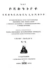 Новий період вірменської лексикографії ділиться на два етапи — з початку до 70-х років XIX століття і з 80-х років XIX століття до радянізації Вірменії[128]. «Новий словник давньовірменської мови» (т. 1-2, 1836—1837) Габріеля Аветікяна, Хачатура Сюрмеляна и Мкртича Авгеряна містить багату лексику грабару і досі вважається одним з основних джерел для його вивчення. Виходячи з філологічних завдань, автори дають грецький і латинський еквіваленти, а також турецькі переклади для західних вірмен. На базі цього словника в 1846 році вийшов ручний словник, друге повне видання якого (1865) містило понад 5 тис. нових слів. Вірмено-латинський словник (1837) Манвела Джахджахяна містить майже настільки ж багату лексику грабару як «Новий словник давньовірменської мови»[117].