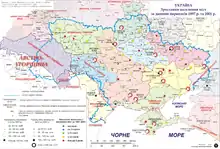 - На карті з'ясовано розміщення міст та показано, який відсоток творить міська людність у порівнянні з усією людністю. За міста С. С. Р. Р. вважали ми справдішні міста та т. зв. оселі міського типу, себто — оселі, що, правда, назви міст не мають, але їх населення живе частинно з промислу й торговлі й числить понад 2.000 людей, у Польщі й у Румунії принято за міста оселі, які за міста вважає адміністрація; в Чехословаччині й на Угорщині, — де ледви дрібна частина осель, що з господарського погляду є містами, має назву міст — уважається за міста оселі, що налічують поверх 5.000 людей і мають з погляду господарського характер міста. При з'ясуванні відсотка міської людности взято за територіяльну підставу обчислень адміністративні одиниці. Але що немає в усіх українських землях адміністративних одиниць подібної величини, і зокрема в С. С. Р. Р. підставою обчислень не можуть бути ані райони (за малі), ані великі области — в С. С. Р. Р. взято за підставову територіяльну одиницю передвоєнні повіти (чи власне — групи районів, що відповідають давнім повітам), у Польщі й у Румунії — теперішні повіти, в Чехословаччині, де повіти є за дрібні, згруповано їх у давні жупи (комітати), які ще тепер є важними антропоґеоґрафічними й історичними одиницями.
