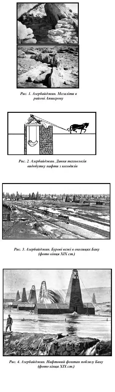 Перші свідоцтва про використання нафти для світильників та обігрівачів з'являються з IV тисячоліття до р. Х. В той період використовували нафту, яка самовиливалася на поверхню з природних виходів. Геродот, який в V ст. до РХ відвідав землі персів, описав колодязну технологію видобутку нафти з використанням міхів як черпаків та ємностей для відстоювання. За свідоцтвами арабських географів X ст. (Масуді, Істахрі та ін.), які відвідали район сучасного Баку, місцеві мешканці використовували нафту й нафтовий газ для кип'ятіння води, приготування їжі, випалювання вапно, у військових цілях і навіть в медицині. Торговельний видобуток нафти почався з кінця XVI ст. нафту витягали з колодязів глибиною до 30-40 м. Перший ґрунтовний опис бакинського нафтового промислу було зроблено в 1683 р. Е. Кемпфером. В цей час тут видобували лише близько 700 пудів нафти за добу.