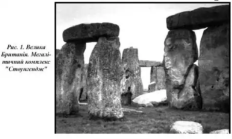 Знаходиться посеред рівнини Солсбері в Уїлтширі. З Уельсу було привезено 80 брил блакитного пісковика, з яких було складено два концентричних кола. Пізніше замість них було споруджене кільце з 30 величезних монолітів — сарсенів. Всередині цього кільця знаходилися дві підковоподібні конструкції — зовнішня складалася з п'яти сарсенових дольменів (двох вертикальних каменів — менгірів і одного горизонтального), а внутрішня — з 19 кромлехів (плит блакитного пісковика). Сарсени зовнішнього кола, що досягають висоти 5 м, важать близько 26 т кожний. Дата будівництва першого комплексу Стоунгенджа між 2100 і 1600 до РХ"
