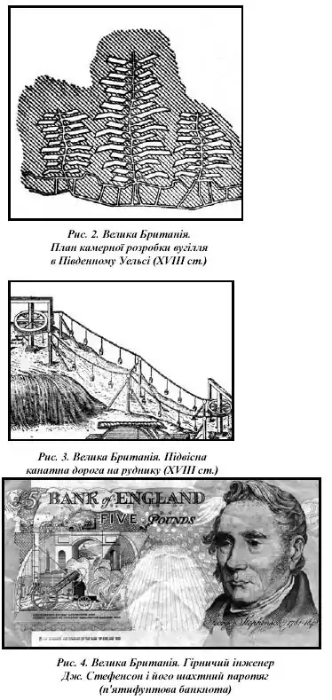 Вугільна галузь Великої Британії була однією з основних, яка заклала основи так званої промислової революції. Саме у вугільній промисловості вперше застосовують паровий двигун Т. Сейвері, який отримав назву «друг шахтаря». У XVIII ст. для водовідливу застосовують насос з паровим двигуном Т.Ньюкомена. Це суттєво збільшило можливості розробки обводнених дільниць на великих глибинах. У 1774 р. Дж. Ватт використав для водовідливу на шахті першу парову машину. У 1738 р. на шахті в Уайтгейвені вперше були прокладені стальні рейки. На початку XIX ст. гірничий інженер р. Тревітик запропонував використовувати для транспортування візків з вугіллям парові двигуни. В 1814 р. Дж. Стефенсон створив перший паротяг для шахтної рейкової дороги. В ці часи в гірництві Великої Британії використовують нові технічні засоби — шахтні вентилятори з паровим приводом, безпечну рудникову лампу, в якій вогонь був ізольований щільною металевою сіткою (Г.Деві та Дж. Стефенсон, 1815). Кріплення в лавах здійснювали дерев'яними стояками, а з середини XIX ст. з'являються перші в світовому гірництві англійські чавунні стояки. Виймання вугілля проводили ручним інструментом (здебільшого — обушок), за допомогою врубових машин, а також вибухових речовин. Використання електроенергії в гірничій справі почалося з 1880 р. У 1903 р. працювало 149 електричних врубових машин. Наприкінці XIX ст. в країні було близько 4000 шахт, а щорічний видобуток вугілля становив близько 200 млн т. Найвищого підйому вугільна галузь досягла перед першою світовою війною (в 1914—1918 рр. видобувалося близько 290 млн т вугілля на рік). У 1947 р. вугільна промисловість була націоналізована. В 70-х роках XX ст. видобуток вугілля у Великої Британії становив близько 50 % від західноєвропейського, але в 80-ті роки в зв'язку з вичерпанням конкурентноспроможних покладів проведена реструктуризація галузі з ліквідацією значної частини збиткових шахт.