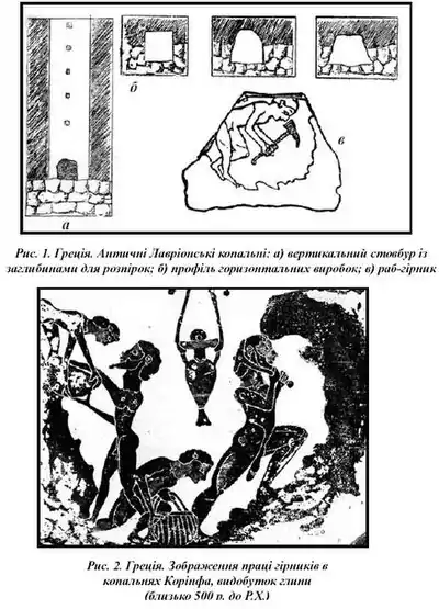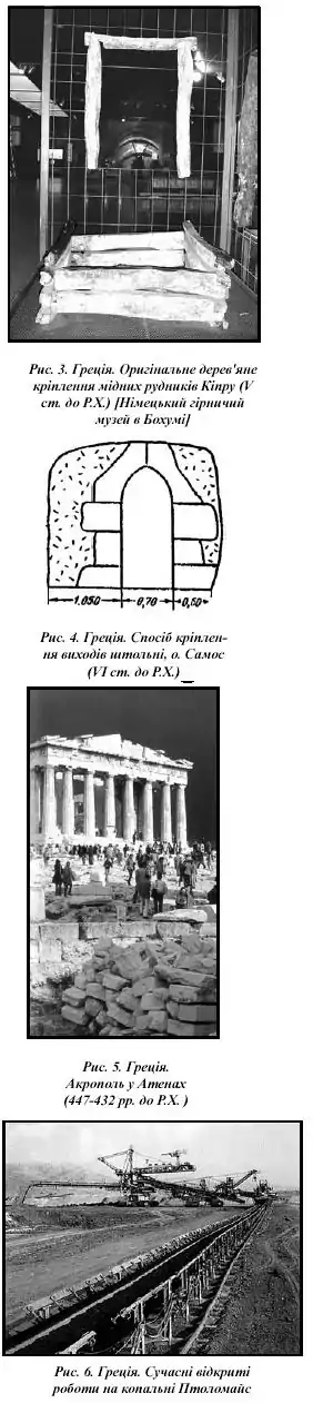 Геродот вважав однією з трьох найбільших споруд еллінів водопровідну штольню на острові Самос, споруджену за наказом царя Полікрата у VI столітті до н. е. Її довжина — 1,5 км, висота 1,7-2,0 м, ширина — 1,7-2,3 м. Тоді ж в Афінах Пісістратом побудована відома штольня. Старогрецькі філософи класичної доби Аристотель і Теофраст у своїх працях («Метеорологія», «Про каміння»), які були написані за чотири століття до н. е., згадують про вугілля (горюче каміння, яке «самоопорожнюється» при горінні), характеризують властивості гірських порід.