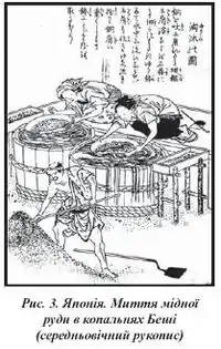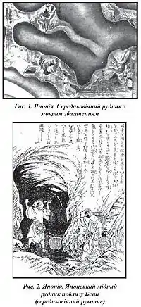 Середньовічна Японія була одним із азійських лідерів видобутку міді, експорт якої здійснювався в країни Азії (в першу чергу в Китай), а з XVII ст. — також в Європу (Голландію). Старовинні японські гравюри (рис. 2 і 3) дають уявлення про особливості місцевої розробки мідних руд.