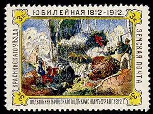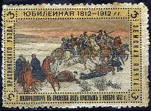 ![]() Марка Краснинського повіту до 100-річчя Франко-російської (Вітчизняної) війни 1812 года. Подвиг Невірівського під Красним (1912) |