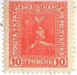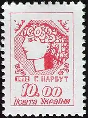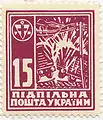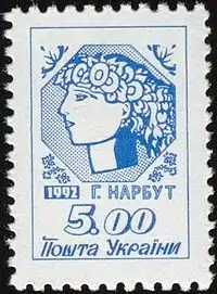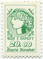 Перший випуск стандартних поштових марок («Алегорія „Молода Україна“ за мал. Г.Нарбута, 1918 р.»)
