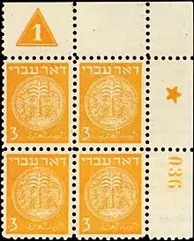 - Stamp production was secretive due to the difficult political and military conditions of the period. Coins Doar Ivri 1948. [Israel] Stamps catalog. Israel Philatelic Federation. Процитовано 7 лютого 2008. Див. також: Doar Ivri 1948. [IPF] Articles. Israel Philatelic Federation. Процитовано 7 лютого 2008. та Doar Ivri (Jerusalem 73 miniature sheets). [IPF] Articles. Israel Philatelic Federation. Процитовано 7 лютого 2008., де зазначено: "...evidence has been preserved of the circumstances surrounding the preparation and printing of Israel's first stamps in 1948 - the haste and secrecy connected with the preparation of the designs by the artist Otte Wallish; the color trials of the eight stamps produced on the Haaretz newspaper press in Tel Aviv; the collecting of a sufficient stock of paper obtained from all manner of unconventional sources, the setting-up of the printing press in the Kirya (government office center) and the conspiratorial beginnings of the printing of the stamps even before the termination of the British Mandate." Some 10 and 15 mil stamps were printed missing a line of the tab inscription.