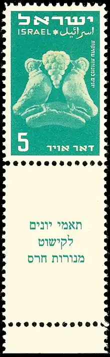 - з 1948 по 1954 рік написи по краях листка були івритом (за чотирма винятками: марки, присвячені Маккабіаді, ізраїльським облігаціям, Всесвітньому конгресу сіоністів та Сіоністській організації Америки);