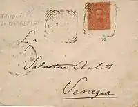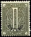 Приблизно у 1888 році з'являється перша марка, яку було виготовлено на території Лівії для вжитку у Лівії: ця честь належить наддруківці у 5 сентесимо на бісекті марки у 10 сентесимо, що було виготовлено в італійському поштовому відділенні, за припущеннями — через нестачу марок у 5 сентесимо для нового тарифу у 25 сентесимо.