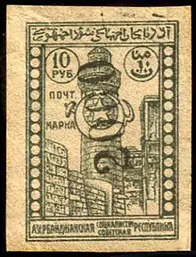 До 1991 року на території Азербайджану для поштової оплати використовувалися поштові марки СРСР. Серед них були випущені близько 60 поштових марок із зображенням видатних діячів, архітектури, фауни та іншими сюжетами, пов'язаними з Азербайджаном.[5]