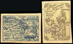 22 жовтня 1921 були випущені дві поштово-благодійні марки на користь голодуючих губерній Поволжя. Марки були віддруковані літографським способом на сіруватою папері, накладом по 2 500 000 штук кожна. На них були зображені селянин, що везе на санях продовольство голодуючим, і жінка з дітьми (голодуюча сім'я). Протягом тижня з 22 по 29 жовтня доходи від реалізації марок надходили на користь голодуючих. У деяких поштових відділеннях районів Азербайджану ці марки використовувалися для оплати поштової кореспонденції і після «Тижня допомоги голодуючим», але доходи від них надходили вже на користь поштового відомства. Такі марки у гасінні вигляді, і особливо на листах, дуже рідкісні. Автор всіх марок Азербайджанської РСР — бакинський графік-сатирик Б. Р. Телінгатер (Бено).