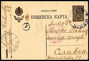 У 1915 році під час Першої світової війни Болгарією були окуповані південна частина Сербії і територія на схід від річки Морави. Восени того ж року на зайнятій території болгарською владою були організовані поштові контори для загального користування. Перші болгарські поштові контори почали функціонувати 1 листопада 1915 року в Біла-Паланці. До кінця 1916 року їх було засновано 88: у Бабушниці, Брза-Паланці, Власотинці, Вранє, Деспотоваці, Долні-Мілановаці, Ниші. Також болгарські поштові контори відкривались в тих місцях, де до окупації існували сербські поштові служби. Для поштових потреб використовувалися болгарські знаки поштової оплати. Восени 1918 року болгарські поштові контори були закриті[7].