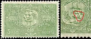 У вересні 1904 року були випущені перші пам'ятні марки Сербії, присвячені 100-річчю Першому сербському повстанню. Сюжетами серії з восьми мініатюр стали портрети засновника династії Карагеоргієвичей Георгія Карагеоргія і короля Петра I Карагеоргієвича. Марки виготовив французький гравер Луї-Ежен Мушон. В грудні того ж року їх було вилучено з обігу, тому що на мініатюрах з портретами виявився третій портрет: якщо дивитися на малюнок в переверненому вигляді, можна побачити між портретами Карагеоргія і Петра I Карагеоргієвича третє обличчя, яке віддалено нагадує посмертну маску вбитого короля Олександра[4][5].