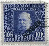 У період австро-угорської окупації під час Першої світової війни на території Сербії використовувалися марки австро-угорської польової пошти і спеціальні випуски для Сербії — марки Боснії і Герцеговини 1912—1914 років з надпечаткою нім. «Serbien»[6]. Перша серія з 21 марки з горизонтальною надпечаткою була підготовлена ще в 1914 році. Однак вони не були випущені в обіг внаслідок відступу австрійської армії. Марки надійшли у продаж в 1916 році, одночасно з другим випуском з діагональною надпечаткою.